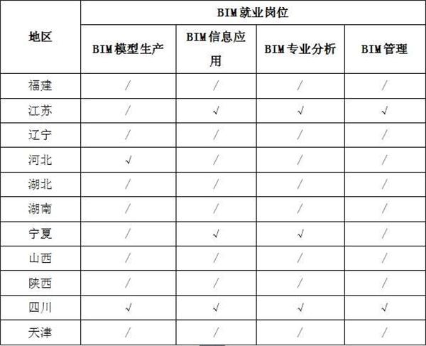 3、就業(yè)崗位分布。從11個省市的BIM就業(yè)崗位分布來看,不同地區(qū)的企業(yè)對BIM人才的崗位需求也各不相同,BIM技術(shù)應(yīng)用發(fā)達(dá)的地區(qū)更需要能將BIM技術(shù)與生產(chǎn)過程融合的復(fù)合型人才,不局限于BIM建模工作,例如江蘇省企業(yè)招聘的人員以BIM信息應(yīng)用,BIM專業(yè)分析和BIM項目管理為主。